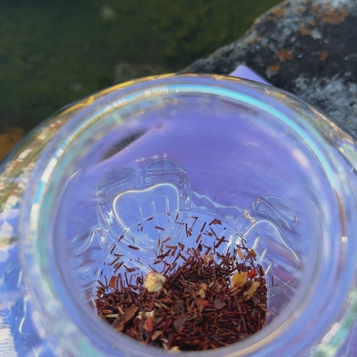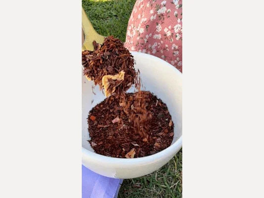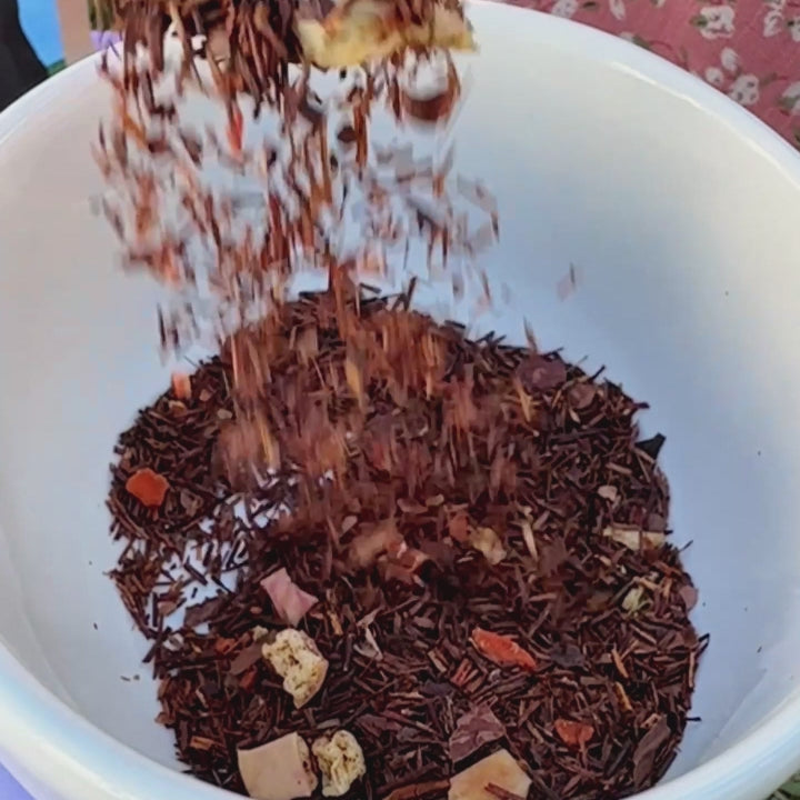 Chá misto de rooibos, cacau, maçã, abacaxi e cenoura com anis estrelado. Sabor baunilha.